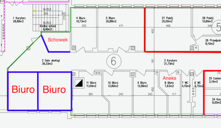 Układ pomieszczeń w galerii zdjęć wraz z obrysem i metrażem pomieszczeń biurowych